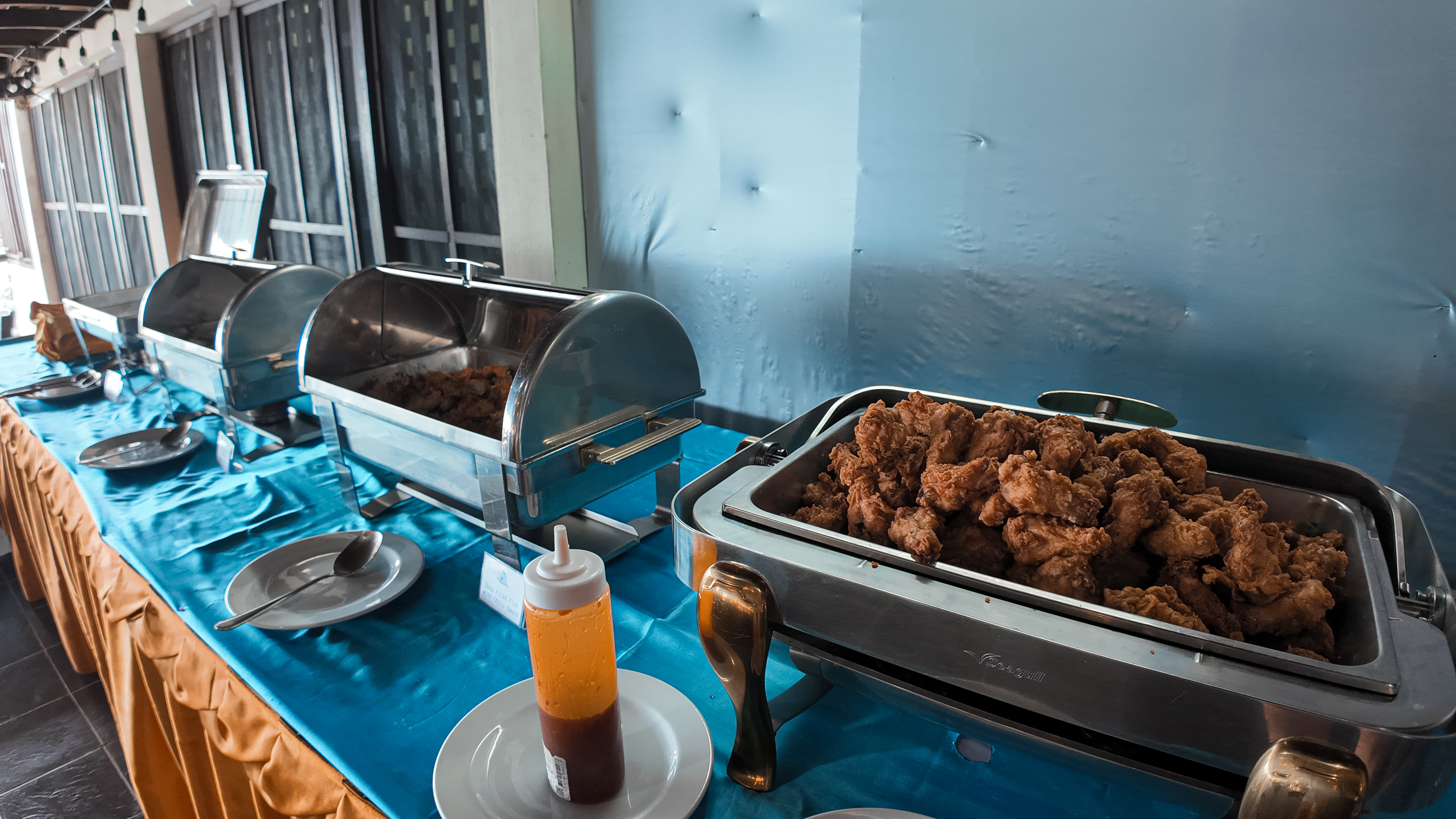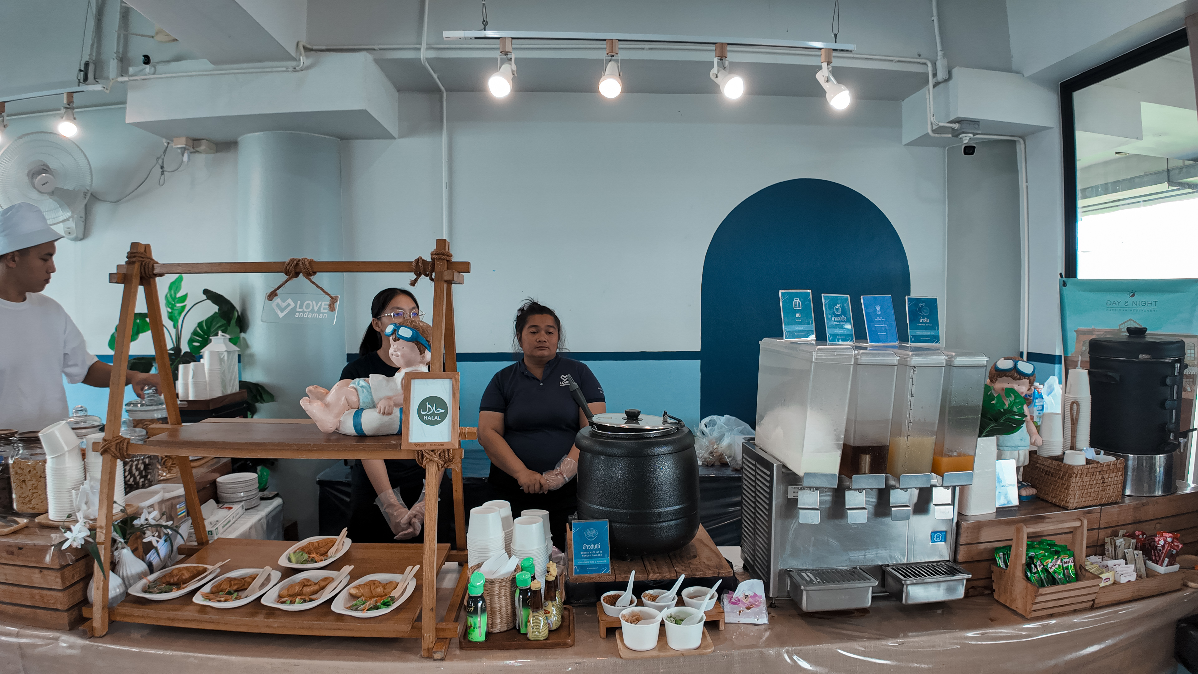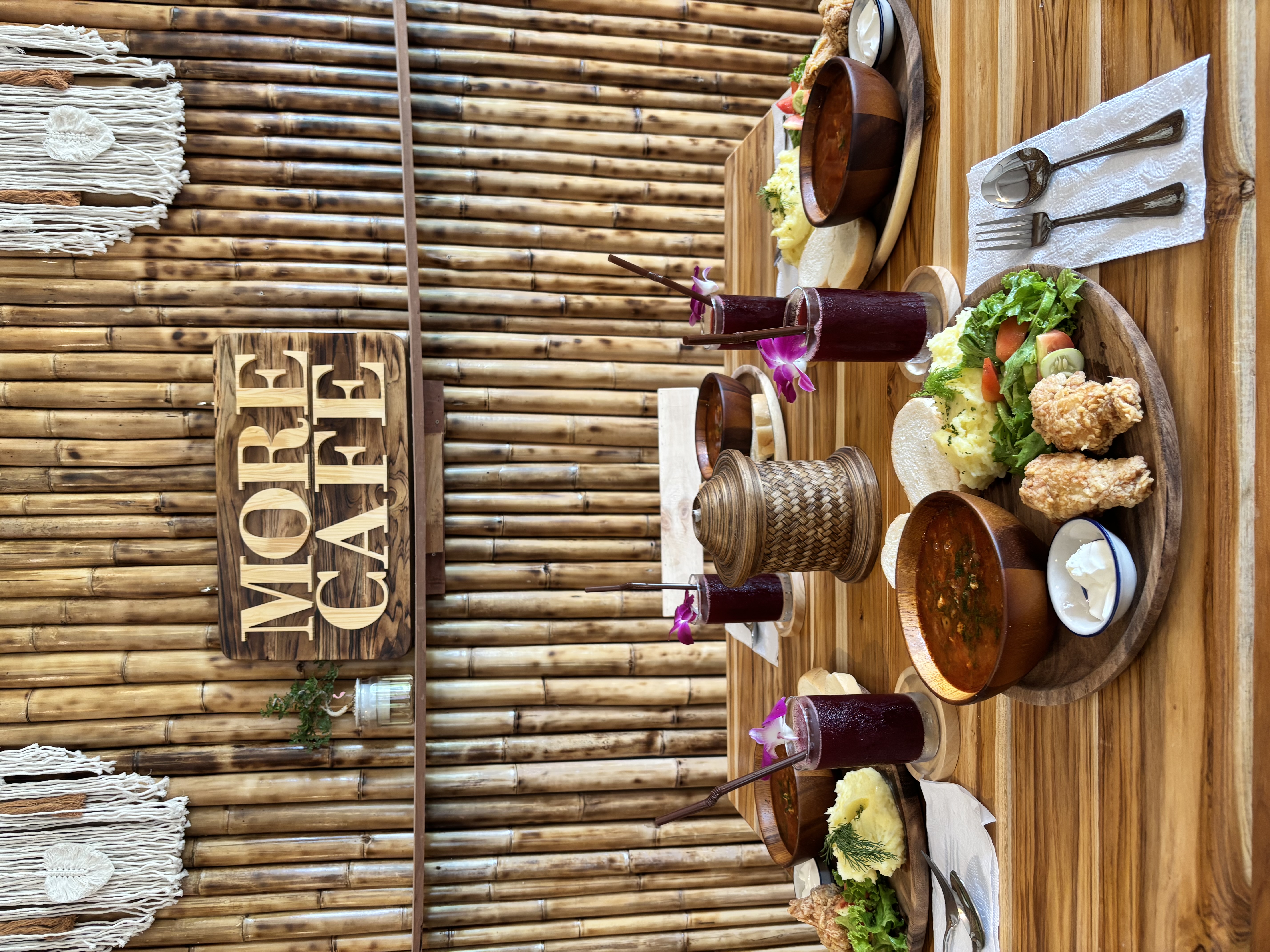Единственный остров в цивилизацией - Пхи Пхи Дон. Жизнь здесь просто бурлит и днем и ночью: большое количество ресторанов, кафе, ночных баров; отелей; хостелов и всевозможных мест с развлечениями. В одном из ресторанов с тайской кухней нас ждет сытный обед из риса, курицы и овощей.